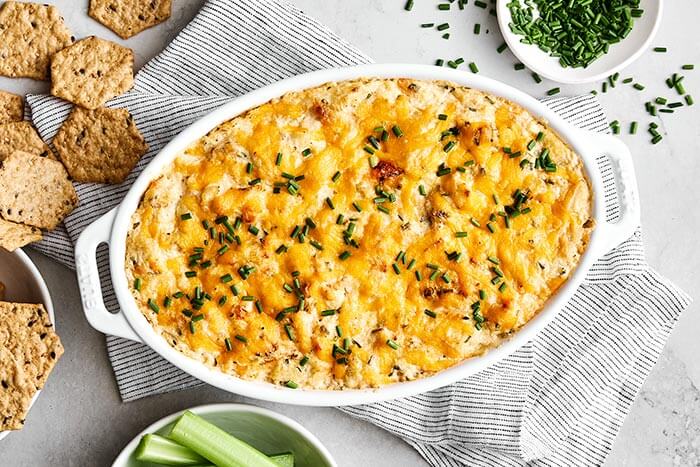 - Serve. Garnish with additional chopped chives and serve warm with crackers, chips, or sliced veggies.