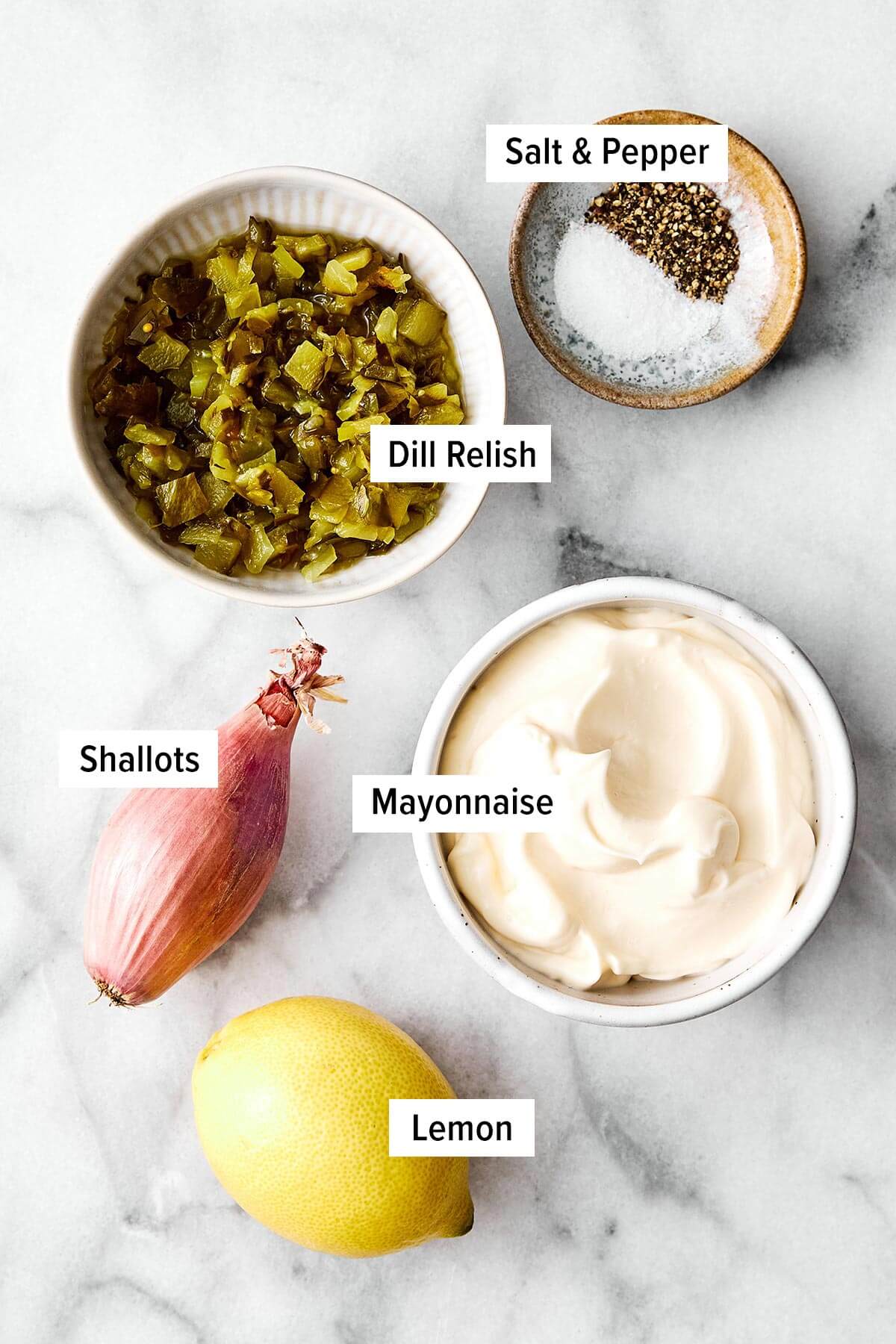 Stir together. Add the mayonnaise, relish, shallot, lemon juice, salt, and black pepper to a bowl. Stir together until it’s all well combined — that’s it!