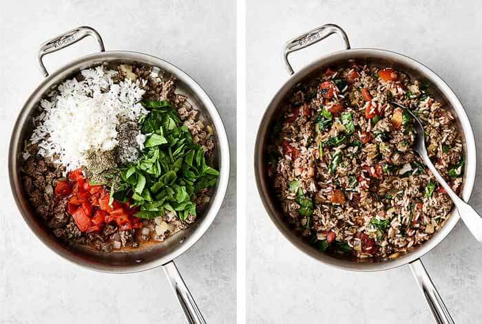 - Add the flavoring. Drain off any excess liquid from the beef and stir in the diced tomatoes, rice, spinach, Italian seasoning, salt, and pepper. Stir for a 1 to 2 minutes, until the spinach is wilted.