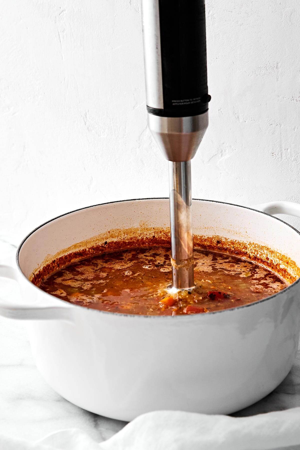 - Blend. You can keep the soup chunky, or use an immersion blender to create a more creamy texture, by spot blending for just a few seconds.